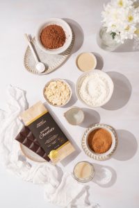 In a large bowl, combine the flour, baking powder, and (for the chocolate version) cocoa powder or (for the white version) almond flour. Mix well.