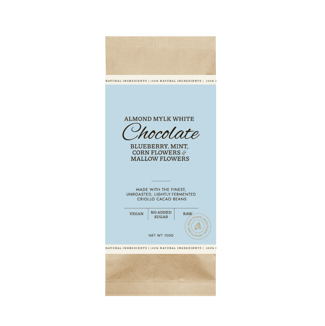 White almond mylk chocolate infused with blueberry juice, berries, mint leaves, cornflowers, and mallow flowers.